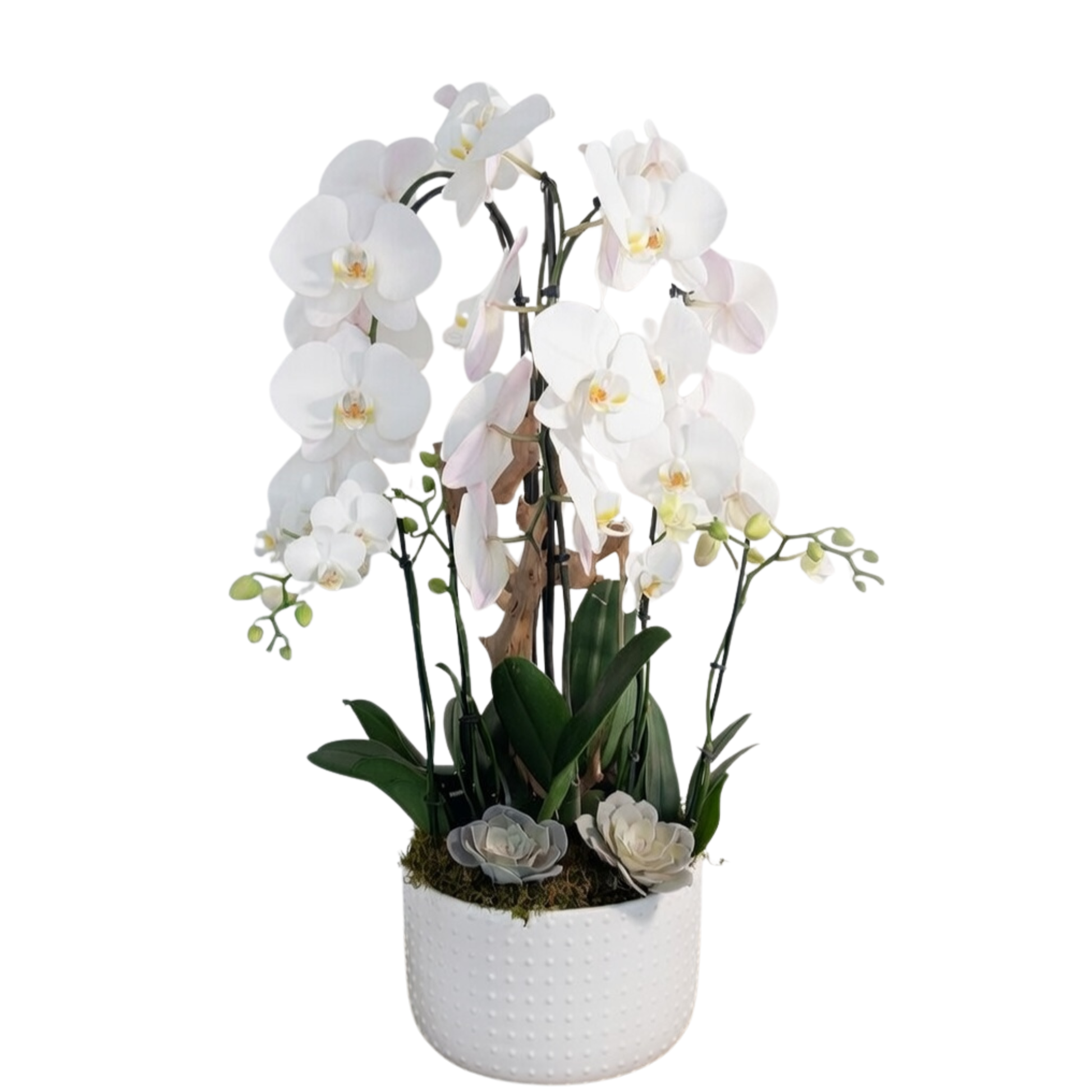 Natural Harmony Orchid Garden is an elegant and organic floral arrangement featuring four large orchid stems and two smaller orchid stems, beautifully displayed in a white ceramic base. Designed to feel fresh and timeless, this arrangement is accented with a natural wood trunk, adding warmth and an earthy touch to the composition.